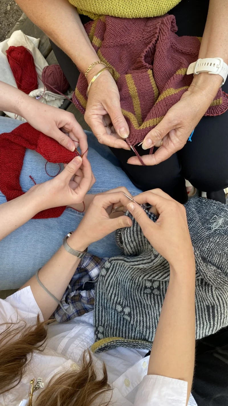 – Folk har stimlet sammen rundt meg for å se hva jeg lager, og jeg har hatt “kurs” i strikking med to farger.