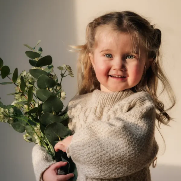 Bevegelsesrom: Bevegelsesrommet for denne genseren er på ca. 10-15 cm avhengig av barnets overvidde. Når du velger størrelse, ta utgangspunkt i barnets målte overvidde og la denne være bestemmende for hvilken størrelse du strikker.