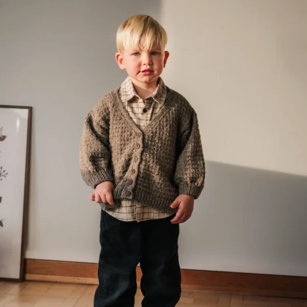 Cardiganen strikkes i Luna lamullgarn, men kan også strikkes i Vidde lamullgarn eller Varde pelsullgarn.