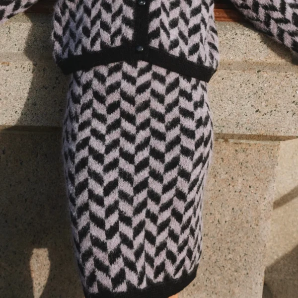 Billie Jean Skirt er en modell i A-fasong. Skjørtet strikkes ovenfra og ned. Linningen strikkes rundt i ensfarget glattstrikk og monteres med en bukseelastikk. Arbeidet fortsetter i mønster etter diagram samtidig som det gjøres økninger på hver side av sidepanelene. Skjørtet avsluttes med en ensfarget dobbeltstrikket kant.