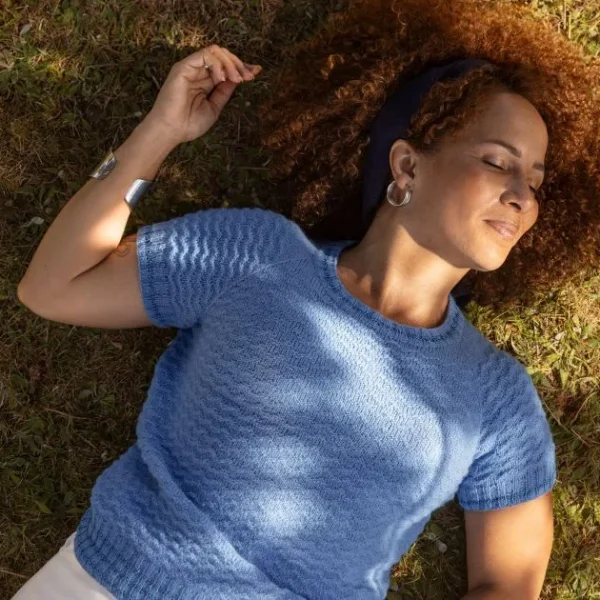 «Bleu» [’blø] er det franske ord for blå. Blå, som havet eller himmelen på en sommerdag. Bleu er strikket i et enkelt strukturmønster i rett og vrang, som kan minne om bølger. I de ribbestrikkede kantene er det lagt inn litt glimmer for å gjøre T-skjorten mer staselig.