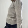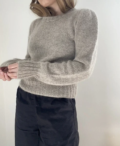 Først strikkes ryggens øverste del fra de skrå skuldrene og et lille stykke ned på bakstykket. Deretter strikkes det opp masker til forstykket langs bakstykkets skuldermasker. Hver side av forstykkets øverste del strikkes for seg. Forstykkets skrå skuldre formes først med vendepinne. Så strikkes det opp masker til toppen av puffermet og ermer, forstykke og bakstykke strikkes samtidig til slutten av ermehullet. Herfra strikkes bol og ermer ferdig for seg. Til slutt strikkes det opp masker til halskant langs halsutringningen. Jeg har brukt kryssopplegg (dvs. vanlig opplegg) til alle opplegg. Alle masker er felt av i rett og vrang (dvs. rettmasker er strikket rett og vrangmasker er strikket vrang, før de felles av).