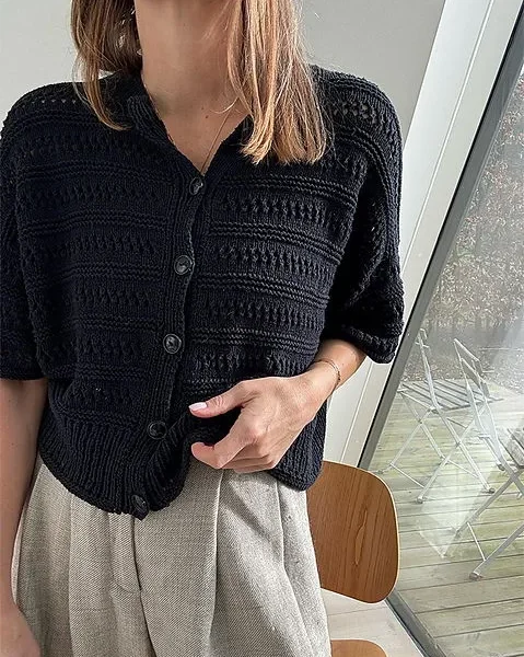 Du strikker cardiganen ovenfra og ned. Først legger du opp masker til bakstykket, hvoretter du strikker frem og tilbake med forkortede pinner for å forme den øverste delen av bakstykket. Deretter strikker du opp masker langs skulderkantene, og strikker skuldrene frem og tilbake hver for seg.