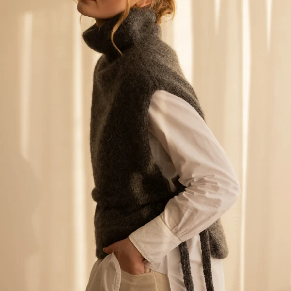 Glattstrikket vest med knytting i sidene og halvhøy hals.