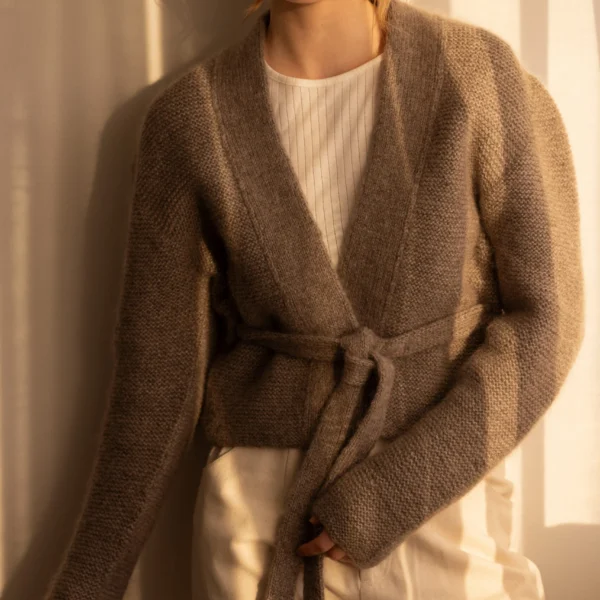 Denne cardiganen strikkes frem og tilbake i rillestrikk ovenfra og ned. Langs cardiganens forstykker og halskant plukkes det opp masker, slik at det strikkes på en bred ribbekant i dobbeltstrikk. Nedover cardiganens ermer felles det masker, slik at de smalner gradvis. Til slutt strikkes et smalt belte i dobbeltstrikket ribb, som festes til cardiganen i midjen.