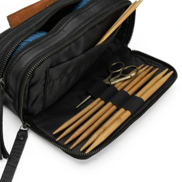Vesken er designet med tre praktiske rom med glidelås som lar deg organisere verktøy og tilbehør. To av rommene har elastiske bånd med lommer for dine favorittheklenåler og strikkepinner. Det midterste rommet er flott for oppbevaring av garnnøster.