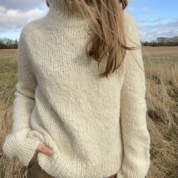 Strikk alt med 1 tråd av hver kvalitet. Genseren strikkes i ett stykke, ovenfra og ned, og med halsutringning foran. Halsutringningen dannes ved hjelp av vendepinner. Samtidig dannes skulderen ved hjelp av økninger på hver pinne. Deretter økes det til ermetopp, arbeidet deles til ermehull og man strikker bol og ermer ferdig for seg. Halskanten er strikket til slutt.
